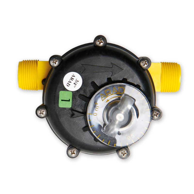 Wassermengenventil "Ginon" mit 3/4" Außengewinde (AG) und 1.000 Liter Skala. Die gewünschte Wassermenge (Durchfluss) kann hier mechanisch eingestellt werden, das Ventil schließt, sobald diese durchgelaufen ist. D.h. man kann hier die Bewässerung über Wassermenge in Liter einstellen.